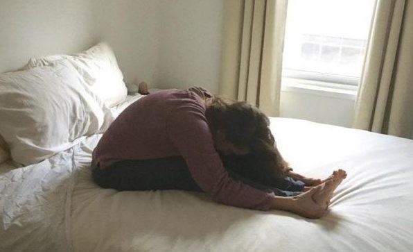 Sedněte si na postel a natáhněte nohy před sebe. Nadechněte se, vydechněte a rukama se snažte dosáhnout palce na nohách. Kolena se snažte nemačká.