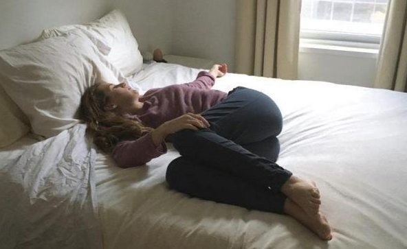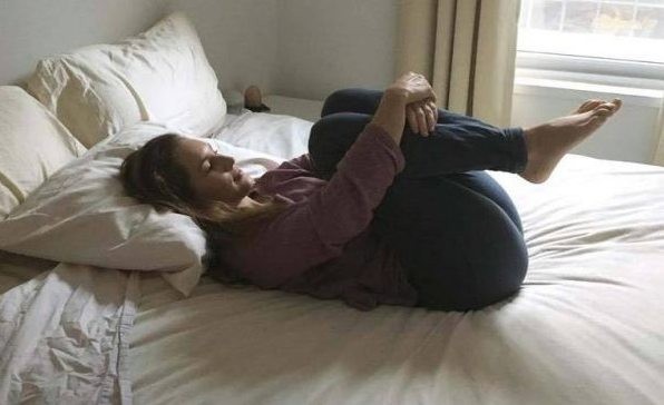 Zůstaňte ležet v posteli a ohněte si nohy v kolenou. Obejměte si kolena rukama a přitáhněte je k hrudi.