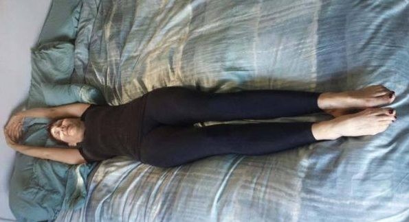 Lehněte si v posteli na záda a rozpažte rukama. V boku se nohama natočte doprava, pravou rukou si zachyťte levé koleno. Hřbet v horní části a ramena ať se dotýkají postele.
