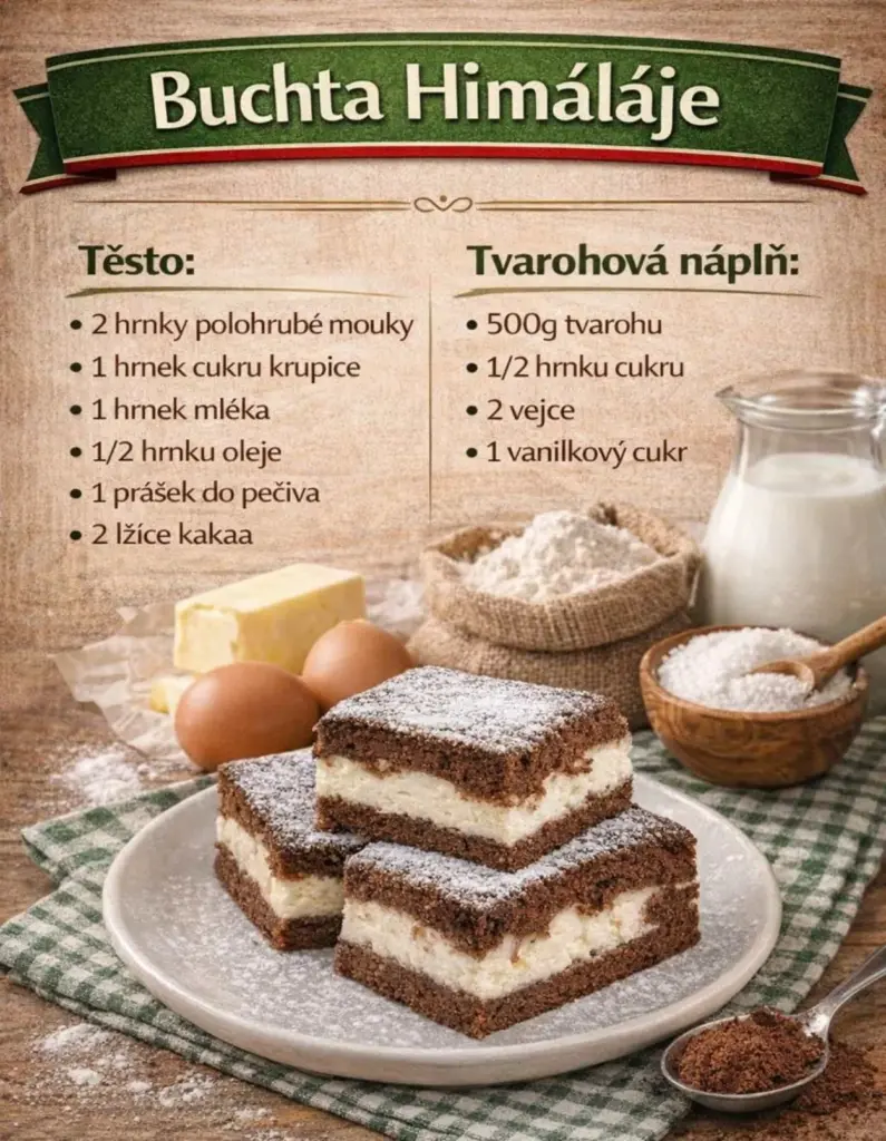 Tvarohová buchta himaláje se peče v českých domácnostech už desítky let. Její kouzlo spočívá v jemné tvarohové vrstvě, kterou doplňuje vláčné kakaové těsto. Hodí se nejen na víkendové pečení, ale i jako rychlý dezert ke kávě nebo čaji. Navíc chutná skvěle čerstvá a často ještě lépe druhý den, kdy se chutě krásně propojí.