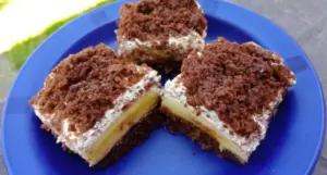 - Krém natřeme na jeden plát upečeného těsta. Ze smetany a ztužovačem si ušleháme šlehačku a netřeme ji na krém. Přikryjeme druhým plátem upečeného těsta.