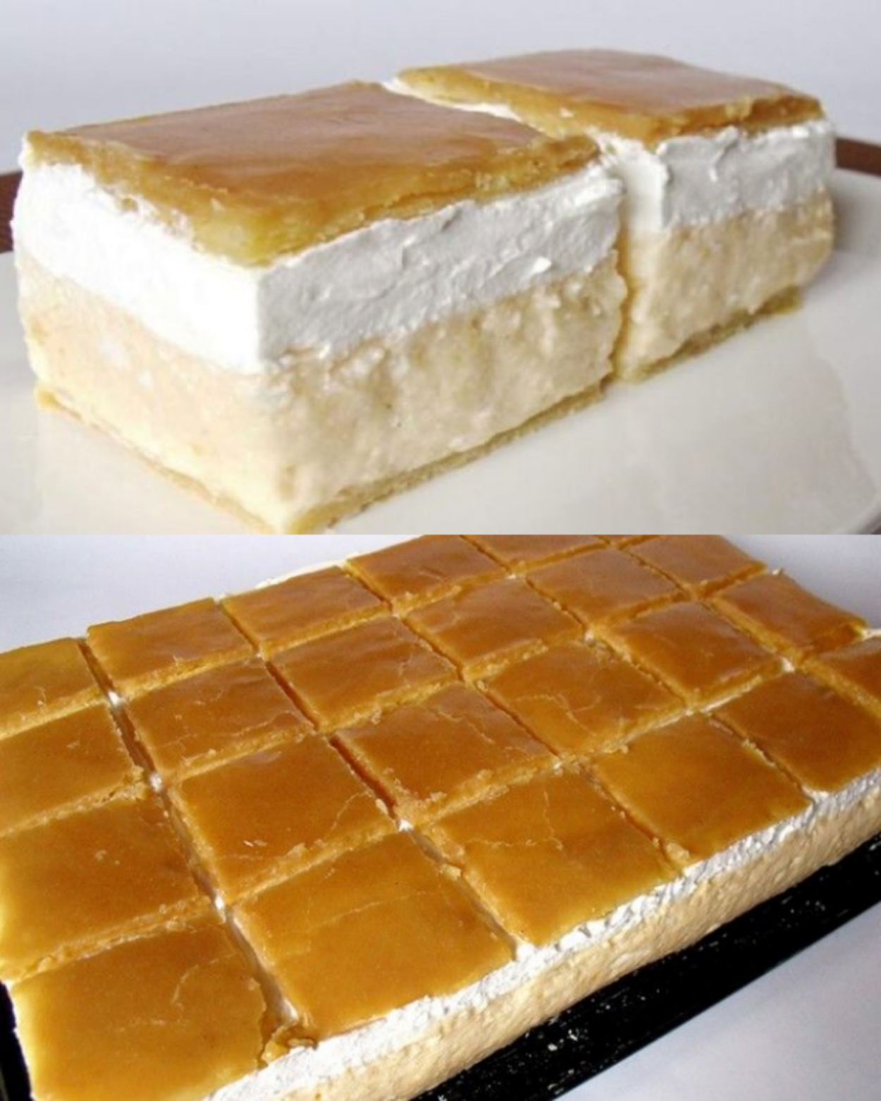 • Dokončení: Položte druhý plát těsta, který jste na začátku polili karamelovou polevou. Nechte dezert ztuhnout v chladničce a nakrájejte na úhledné řezy.