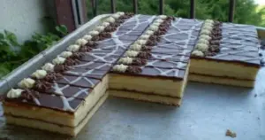 - Na druhý, stejně velký plech na pečení navrstvíme vrstvu krému (snažíme se krém rozdělit rovnoměrně) a oba plechy odložíme na chladné místo odstát, dokud připravíme karamel.