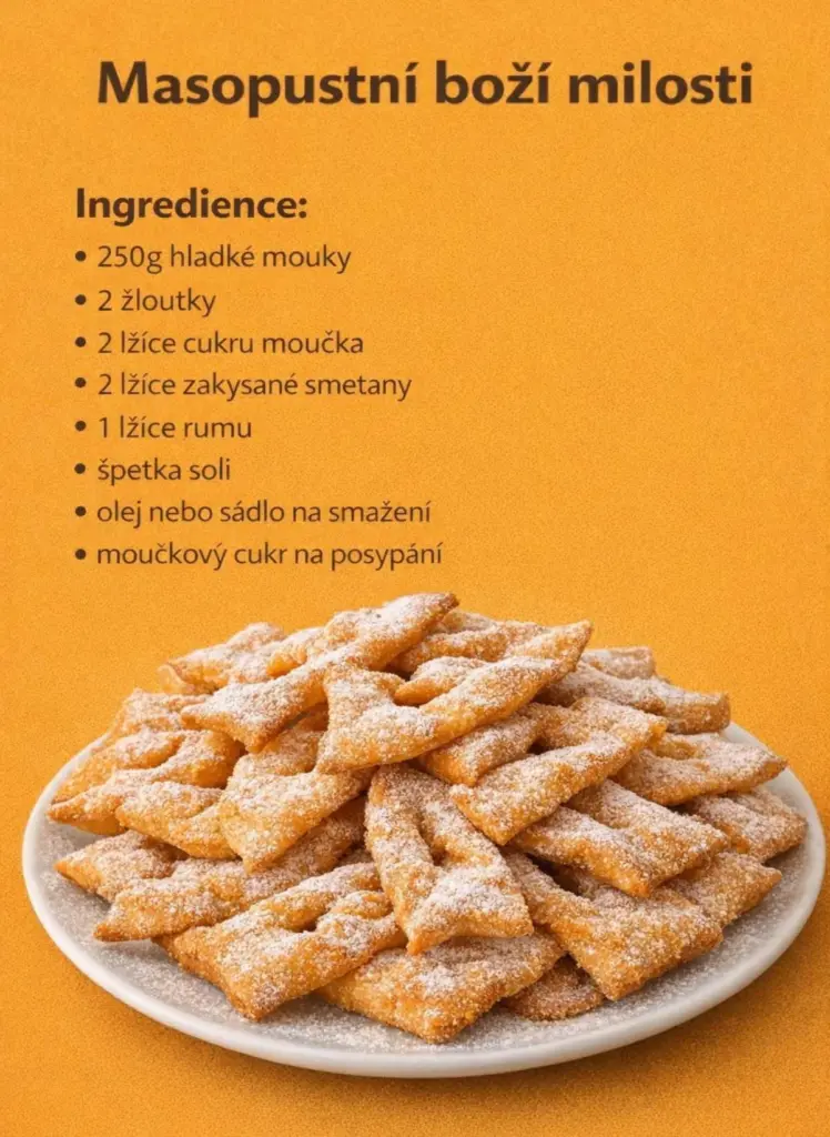 Masopustní boží milosti, známé také jako fánky, patří mezi nejoblíbenější tradiční sladké pečivo české kuchyně. Pokud máte rádi recepty, které se připravují z jednoduchých surovin a mají dlouhou historii, doporučujeme projít i další sladké recepty nebo inspiraci v kategorii pečení, kde najdete mnoho osvědčených receptů na tradiční i moderní dezerty. Boží milosti jsou typické svou křehkostí, jemnou chutí a jednoduchou přípravou bez kynutí.