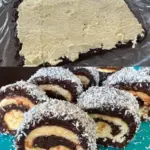 • Srolování a chlazení: Pomocí fólie roládu opatrně srolujte, pevně zabalte a nechte ztuhnout v lednici alespoň 2 hodiny. Po ztuhnutí obalte celou roládu ve strouhaném kokosu a nakrájejte na plátky.