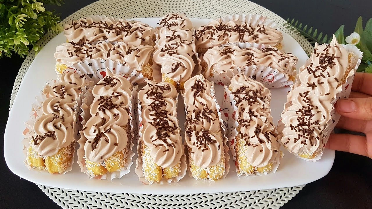 Tyto krémové piškotové tyčinky připomínají mini zákusky z cukrárny – jsou lehké, nadýchané a hotové během pár minut. Dlouhé piškoty tvoří pevný základ, který se po slepení krémem krásně zvláční. Bílý kokos dodá jemnost a čokoládové zdobení se postará o dokonalý vzhled. Ideální sladkost na oslavy, návštěvy nebo jako rychlý domácí dezert.