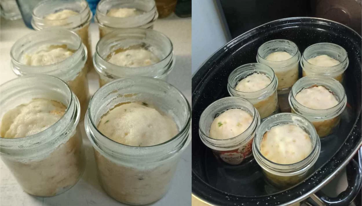 • Plnění a vaření Sklenice naplňte do tří čtvrtin výšky a vložte do hrnce s horkou vodou – hladina by měla sahat přibližně do poloviny výšky sklenice. Přikryjte pokličkou a vařte asi 30 minut (u větší dávky 40 minut).