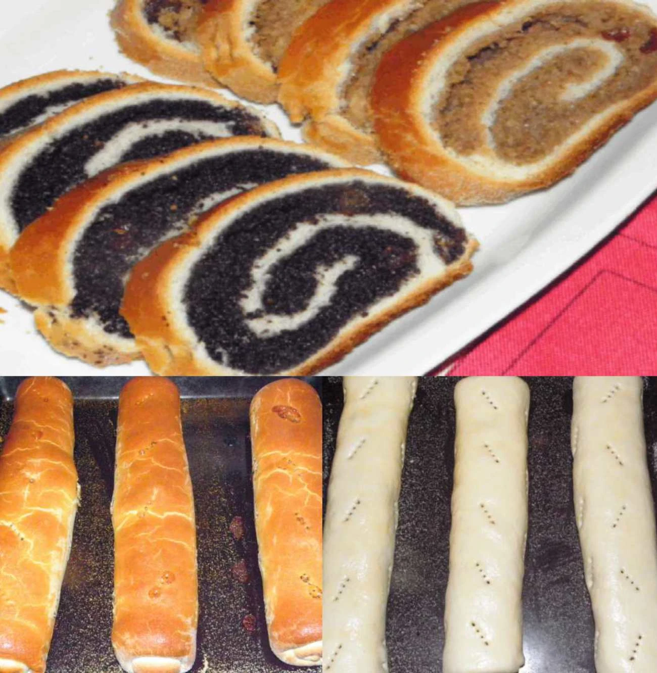 • Tvarování: Těsto ihned rozdělte na 6 částí. Každou vyválejte na velikost plechu. Tři pláty potřete makovou a tři ořechovou náplní. Okraje přehněte dovnitř a zaviňte jako klasický závin.