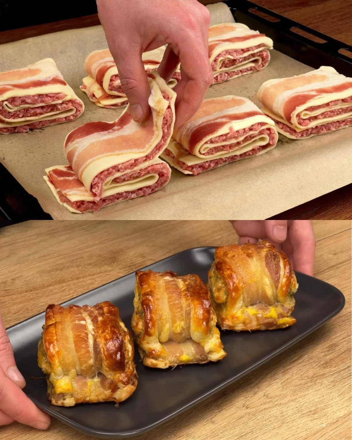 Tyto slané rolky z listového těsta spojují vše, co na rychlém domácím pečení funguje nejlépe: křehké těsto, šťavnatou masovou náplň, jemný krémový sýr a výraznou chuť opečené slaniny. Hodí se jako teplá večeře, pohoštění pro návštěvu i vydatnější slaná svačina.