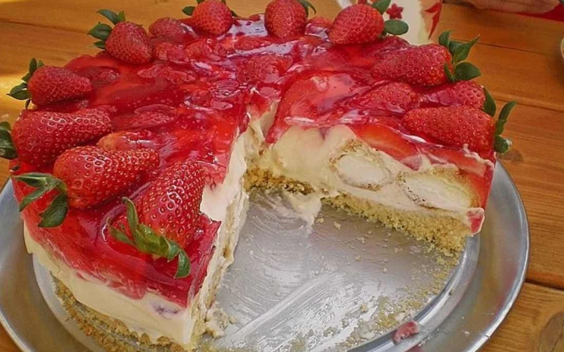 Nadýchaný dort z máslového korpusu, vrstvený šlehačkou s tvarohem, mini větrníčky, čerstvými jahodami a jemným vaječným likérem. Bez složitého pečení, bez kynutí – přesto efektní a osvěžující.